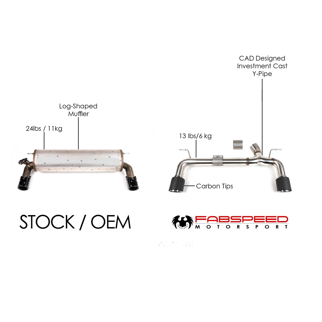 Replace your heavy restrictive BMW log-shaped OEM factory muffler with our Muffler bypass exhaust system for more sound and weight reduction. SOUND: Get the sports car sound your M240 deserves. This system brings out all the pops and crackles in the factory BMW tune, as well as giving the B58 engine a throaty growl under acceleration. BMW enthusiasts worldwide will get the sports car sound the car needs with no interior drone. Clean mean fantastic emissions legal compliant sports car sound! FEATURES: Fits all BMW M240i vehicles 2017+ (2016+ in the EU) Saves 11 lbs / 5 KGs compared to the factory muffler Gives a throaty exhaust note This cat-back system does not interfere with any emissions equipment Will NOT cause a CEL (Check engine light) Choice of tip style; 3 in Polished Stainless Steel, Satin Black and 3.5 in Carbon Fiber Tips Investment cast stainless steel Y-Pipe for maximum exhaust flow 3D laser scanned and CAD-Designed Constructed from CNC mandrel-bent T304L stainless steel All Fabspeed performance products are backed by the Fabspeed Lifetime Warranty NOTE: You must cut your factory exhaust. There is a factory cut location, a dimple is there, which makes locating the cut point easy. This is a factory BMW cut location in case the car is ever in an accident and needs just the rear muffler replaced. Simply cut the pipe and slip on the Fabspeed system. The factory OEM BMW muffler can be reinstalled using our supplied hardware. Therefore our quality engineered design is totally reversible.